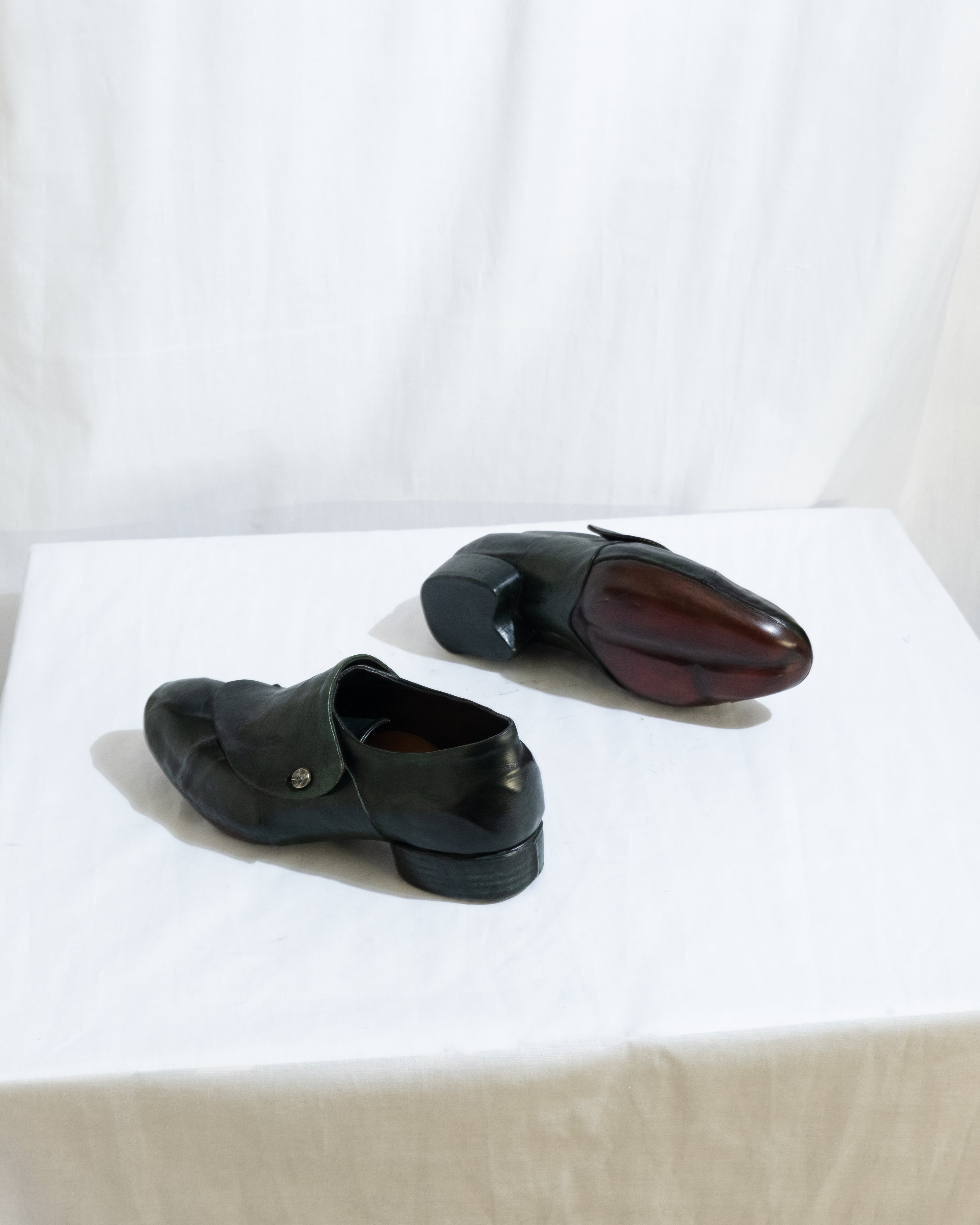 Hand-dyed Vegetable Tanned Culatta (upper), Vegetable Tanned Lamb Leather (lining), Undyed Vegetable Tanned Cow Leather (bottom soles)