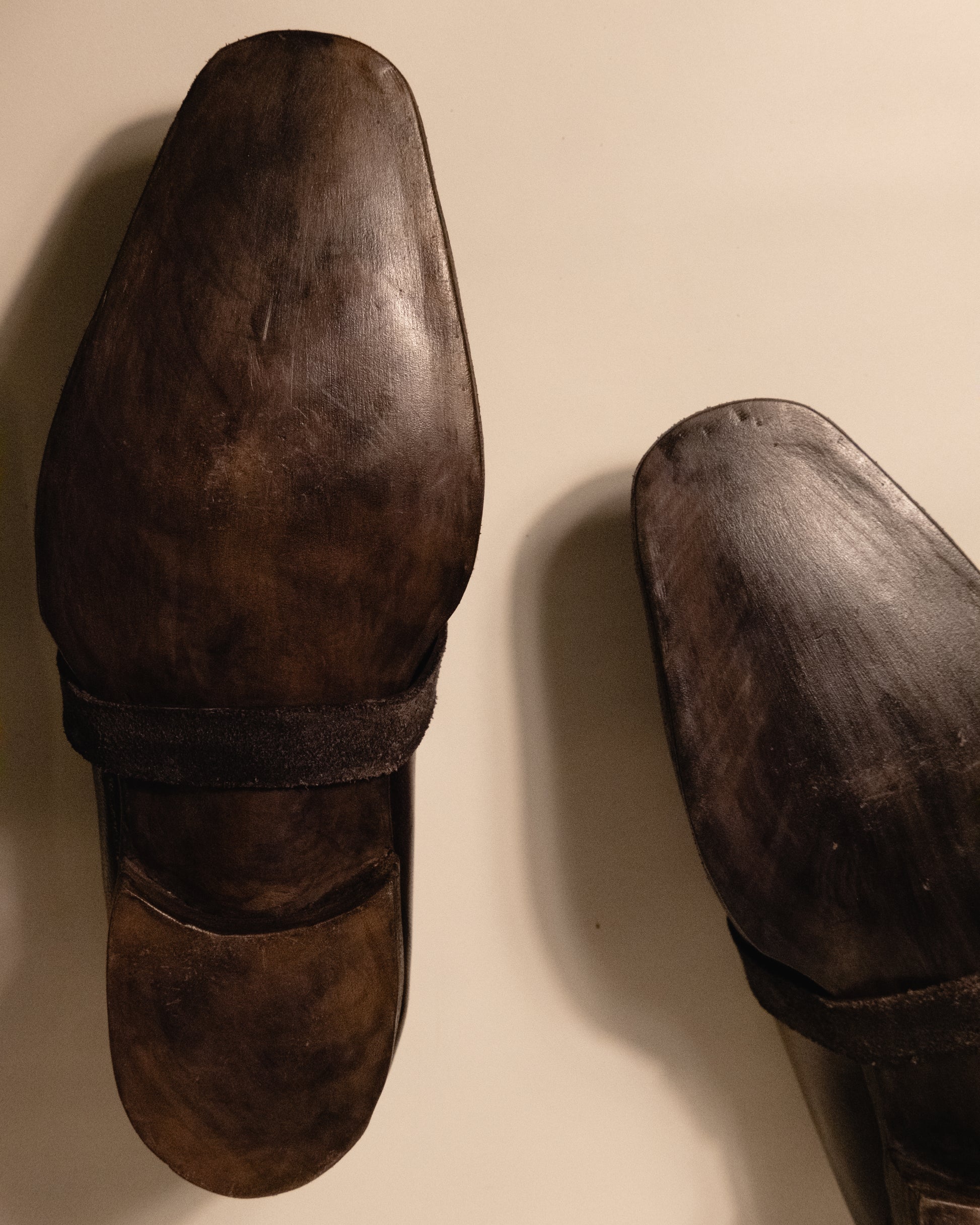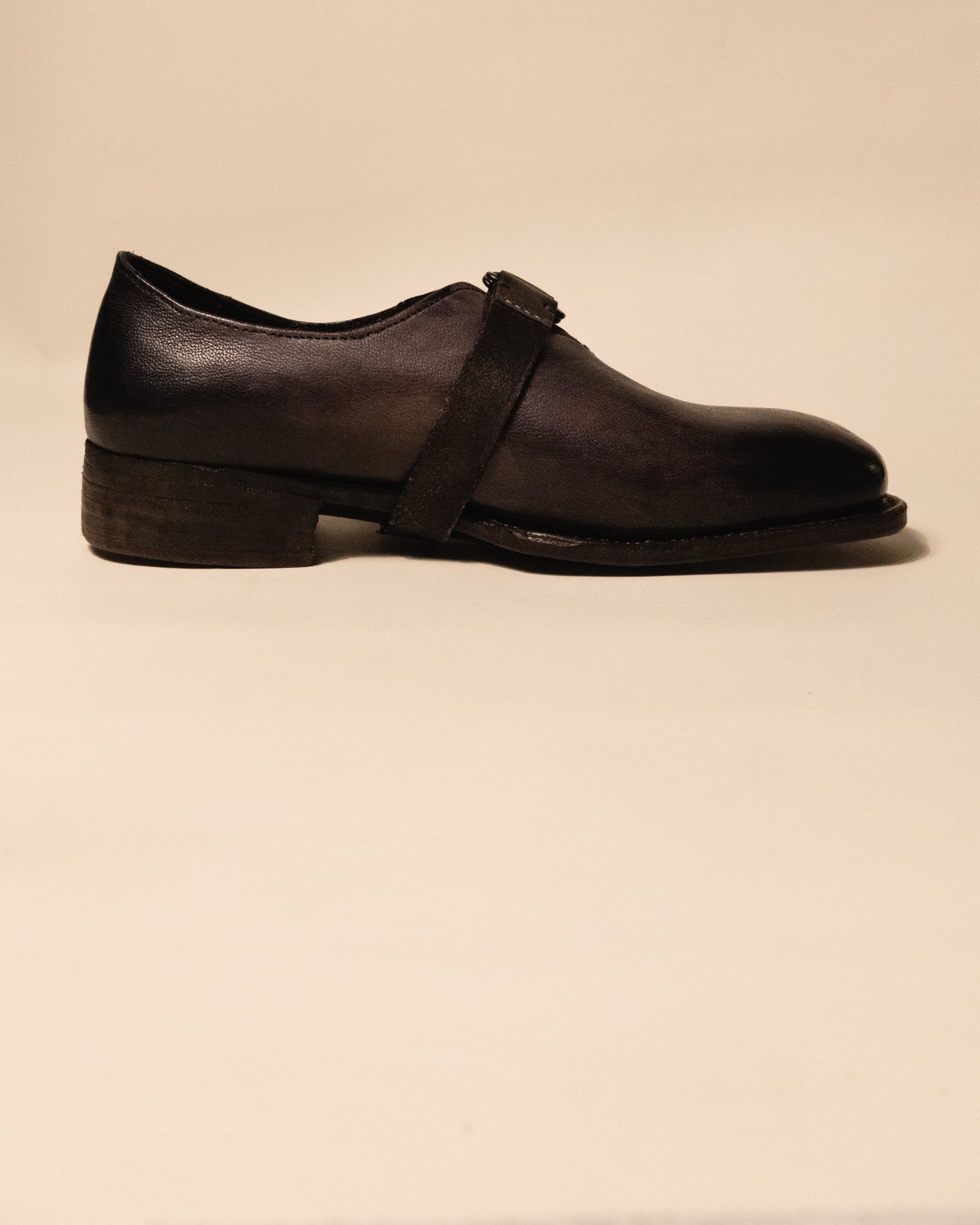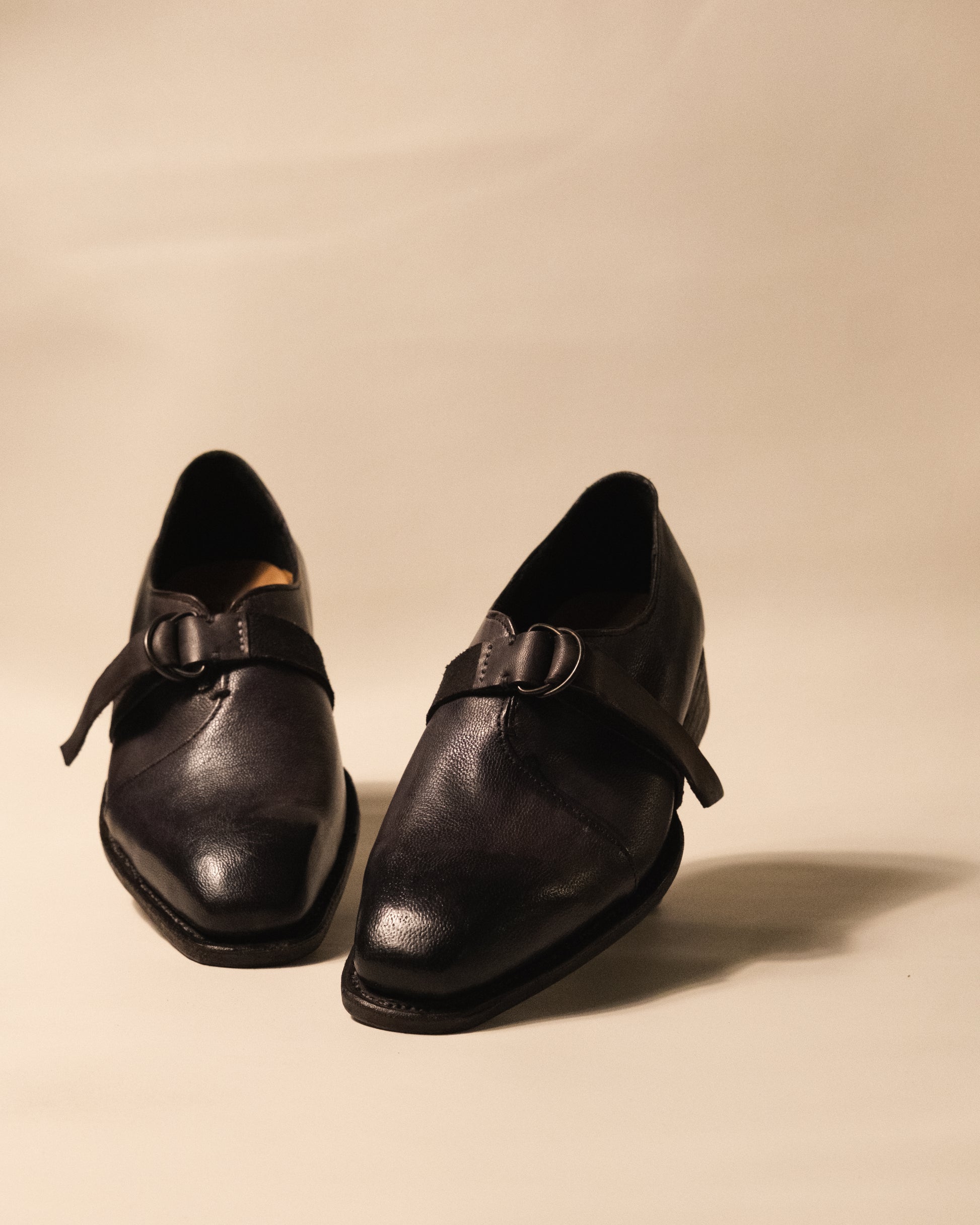 Chemical corroded and dyed iron D-ring on cow belly leather belt